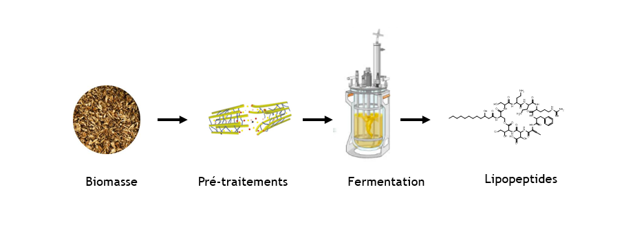 Dans ce contexte, l’objectif général de thèse est de développer un procédé biotechnologique intégré permettant la production de lipopeptides biosourcés par fermentation d’agro-ressources, depuis le prétraitement des biomasses jusqu’à la validation en bioréacteur.