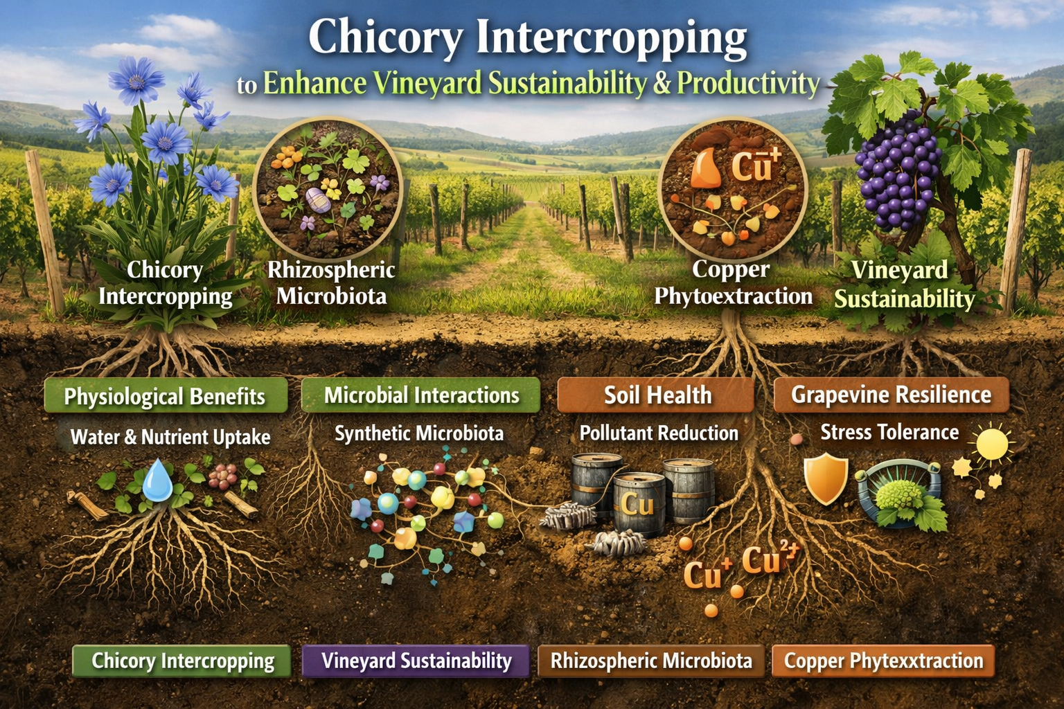 Current agricultural practices are increasingly criticized due to the toxicity of phytosanitary products used in conventional agriculture, as well as copper-based products employed in organic farming. Chicory (Cichorium intybus), recognized for its robustness and hardiness (Hilbert and Rambaud, 2023), represents a significant reservoir of beneficial microorganisms, both at the rhizospheric and endophytic levels (Leclercq L., manuscript in preparation). These microorganisms provide chicory with enhanced tolerance to various environmental stresses, including metals, as well as a proven ability to solubilize phosphate (Leclercq et al., 2025) and to accumulate metals in its roots (Guérin et al., 2022; Wu et al., 2023; Bonisseau, 2024). As an intercrop, chicory shows promising potential for improving soil quality, increasing nutrient availability, and reducing residues of metals and other contaminants, thereby making soils healthier and nutrients more accessible to main crops such as grapevine.